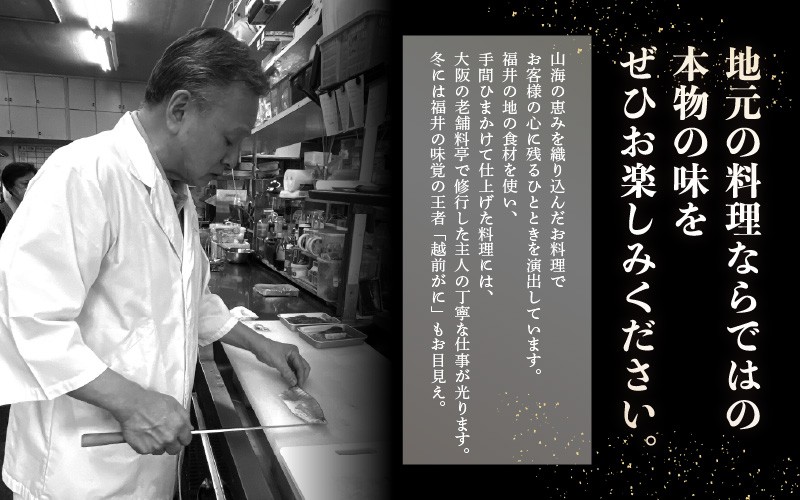 福井の地の食材を使い、手間ひまかけて仕上げた料理には、大阪の老舗料亭で修行した主人の丁寧な仕事が光ります。
