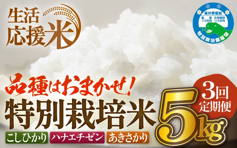 チョイスPayポイントと交換できる品 毎月楽しめる定期便。3ケ月連続でお届けします。 【生活応援米】定期便 ≪3ヶ月連続お届け≫令和7年産 特別栽培米5kg × 3回(合計15kg)福井県越前町産【選べる精米方法:白米/玄米】【お米 コメ kome 5キロ 白米 玄米 家庭用 農薬5割減】 [e81-c001]