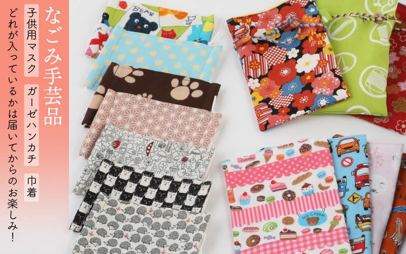 同封する手芸品は、社員が一針一針心を込めて作った子供用マスク、ガーゼハンカチ、または巾着のいずれかになります。