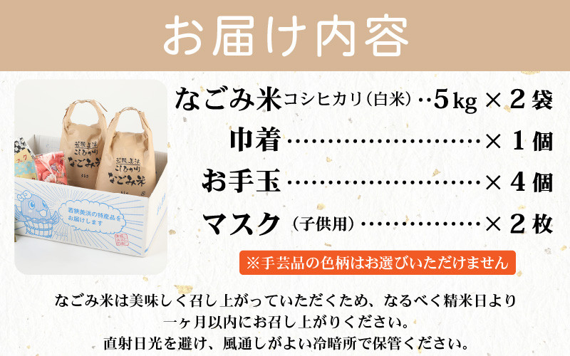 美浜町の美味しいコシヒカリと心をこめて作った手製マスクと巾着お手玉のセットです。 「なごみ米」令和6年産 コシヒカリ 10kg & 手製マスク & 巾着 & お手玉 セット [m12-b001]