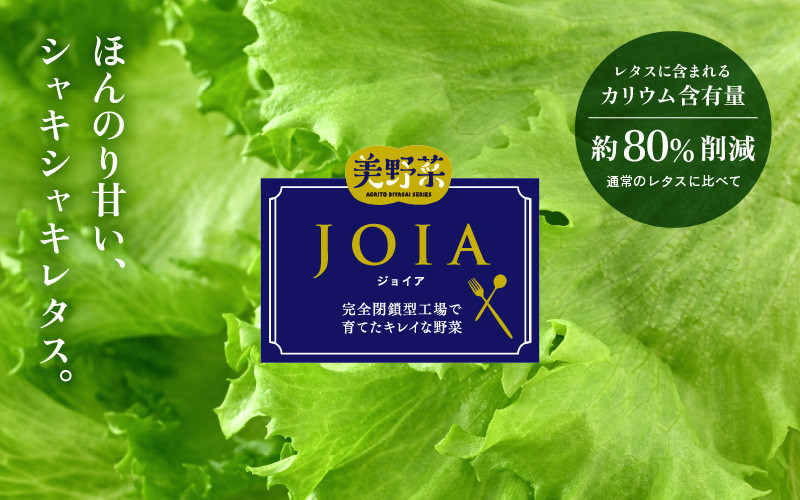 「JOIA(低カリウムレタス)」は、特別なレタスを皆様のお手元にお届けしたいという気持ちを込めて、約一年間かけて秋田県立大学と共同開発したレタスです。弊社独自のレシピにより、「ほんのり甘い・シャキシャキのレタス」が出来上がりました。