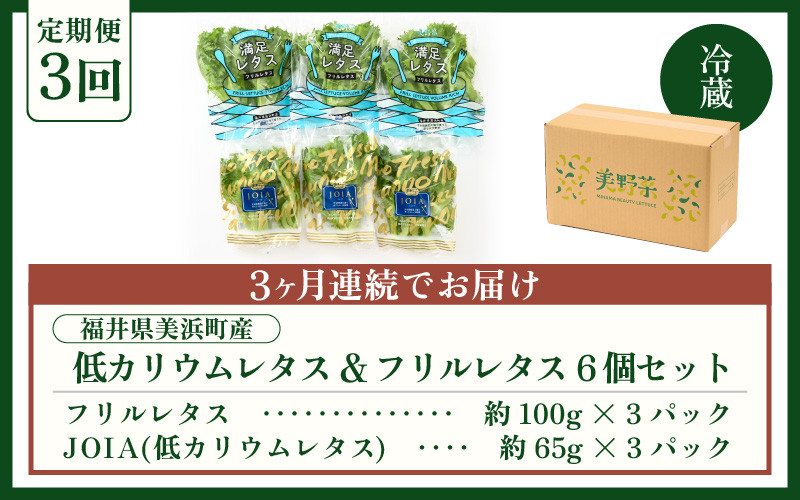 クリーンルーム内で育てたキレイなレタスです。袋から出してそのまま食べられます! 定期便 ≪3ヶ月連続お届け≫ 低カリウムレタス&フリルレタス 計6個セット 全3回 【福井県美浜町産】【野菜 生野菜 レタス サラダ サンドイッチ お弁当 水耕栽培 洗わず食べられる 時短 付け合わせ ダイエット ヘルシー】[m40-a008]