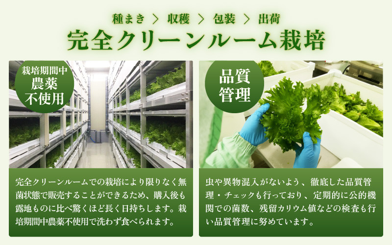 クリーンルーム内にて農薬を使わず育てるため、水洗いの必要がなく、そのままお召し上がりいただけます。