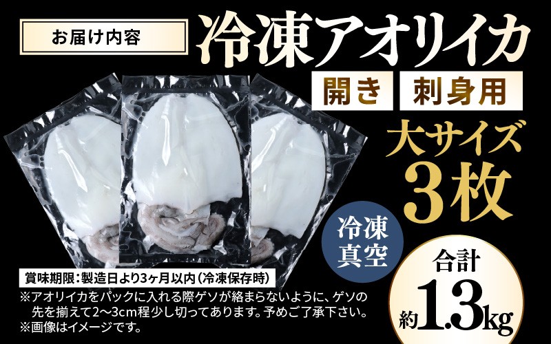 内臓取りやイカ墨で汚れる事一切無し、しかも鮮度抜群! 【先行予約】新鮮で便利!旬の 天然 アオリイカ 刺身用 開き 大サイズ 3枚 約1.3kg 【2026年10月下旬以降順次発送予定】 あおりいか アオリイカ 刺身 お造り 冷凍 いか イカ 海鮮 魚介 冷凍パック 天然いか [m21-e006]