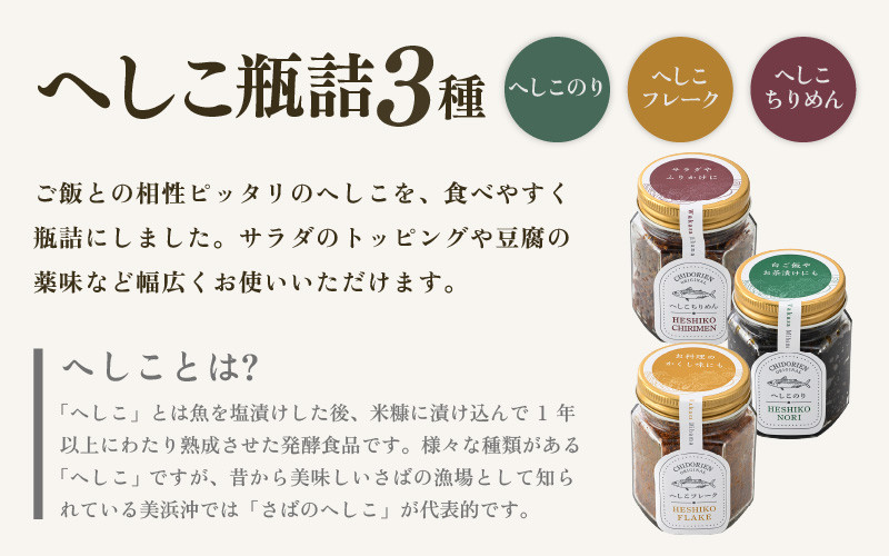 へしこ瓶詰めは、へしこフレーク、へしこのり、へしこちりめんと3種類のお味が楽しめます。