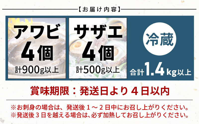 | 容量 | ■内容量/産地 天然!極上アワビ・サザエセットB 【1】アワビ 4個(計900g以上) 【2】サザエ 4個(計500g以上) 産地:美浜町 |