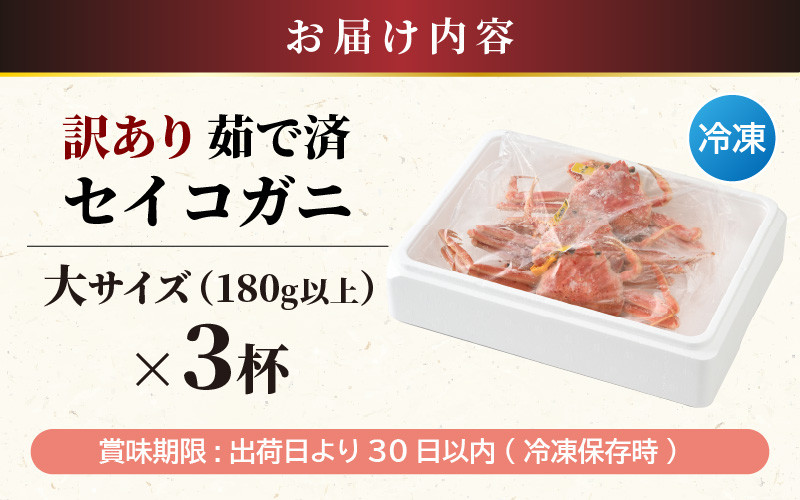 地域の生産者応援の品 【訳あり】地物の越前セイコガニをお手軽にお召し上がり下さい。 【訳あり】【数量限定!】 全て地物! 天然! セイコガニ大(180g~)3杯セット(冷凍)食べ方説明書付き 【カニ かに 蟹 せいこがに 越前セイコガニ ずわいがに ズワイガニ ボイルガニ ボイル わけあり 足折れ 国産 県産 生産者支援 規格外】 [m21-a034]
