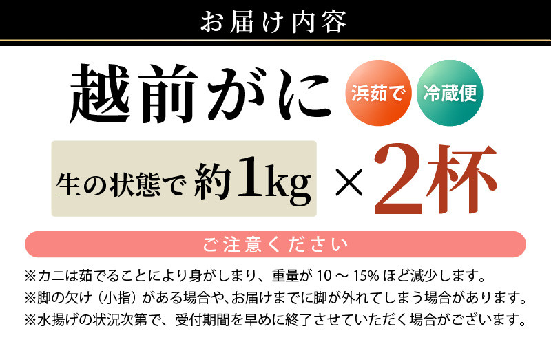 黄色いタグ付き越前がにを釜茹でし、姿ガニのまま冷蔵便でお届けします。 【先行予約】≪浜茹で≫ 天然 越前がに 大サイズ (茹で前約1kg) × 2杯【2026年1月上旬以降順次発送予定】冷蔵便 届いてすぐお召し上がりいただけます! タグ付 福井を代表する冬の味覚 【越前ガニ 越前蟹 かに ずわい ズワイ 福井】 [m17-x002_01]