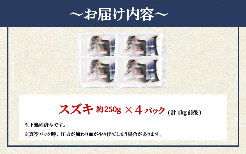 下処理済のスズキを真空パックに詰めました!手間なく様々な料理にご利用いただけます 若狭湾の朝獲れ 天然 スズキ 約1kg (約250g×4パック) 下処理済!生冷凍!だから人気!【 鮮魚 魚介類 海鮮 下処理 小分け 冷凍 切り身 簡単調理 手軽 白身 焼き物 煮つけ 鍋 】[m17-a071]