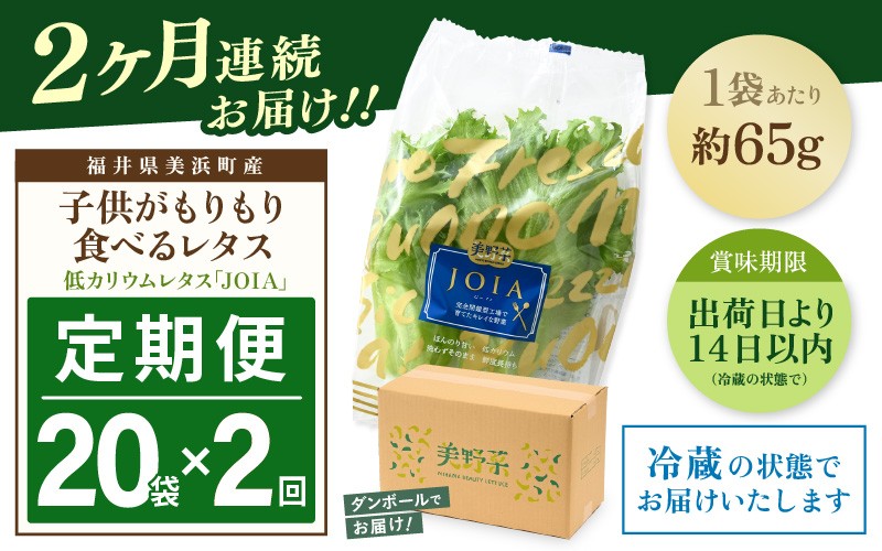 | 容量 | ■内容量/産地 【2ヶ月連続お届け】 低カリウムレタス 美野菜 「JOIA」 約65g × 20袋 産地:福井県美浜町 |
