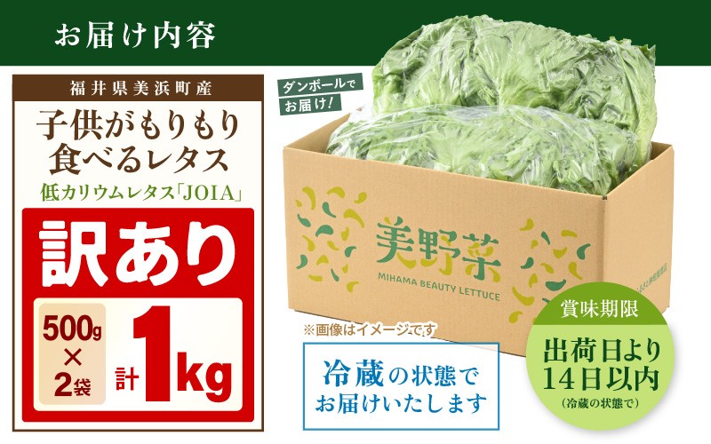 | 容量 | ■内容量/産地 訳あり 低カリウムレタス 美野菜 「JOIA」 500g×2袋 計1kg 産地:福井県美浜町 |