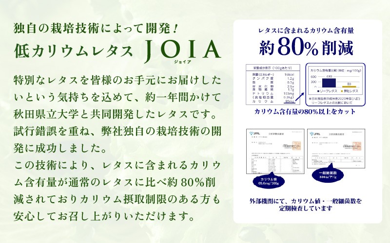 「JOIA」は、秋田県立大学との産学連携により開発された低カリウム・機能性レタス。