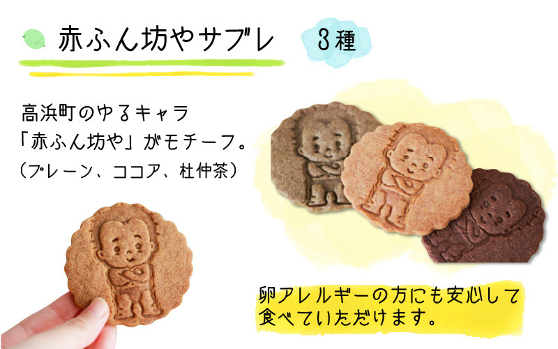 高浜特産の杜仲茶を使用し、昔ながらの製法で作る『杜仲茶あめ』、焦がしバターが魅力の『フィナンシェ』、際立つ杜仲茶と奥ゆかしいバター香る『杜仲茶フィナンシェ』と高浜町のゆるキャラ「赤ふん坊や」をモチーフに、卵アレルギーの方にも安心して食べていただける『赤ふん坊やサブレ』(プレーン、ココア、杜仲茶の全3種)の高浜超(町)満喫のお菓子セットです。
