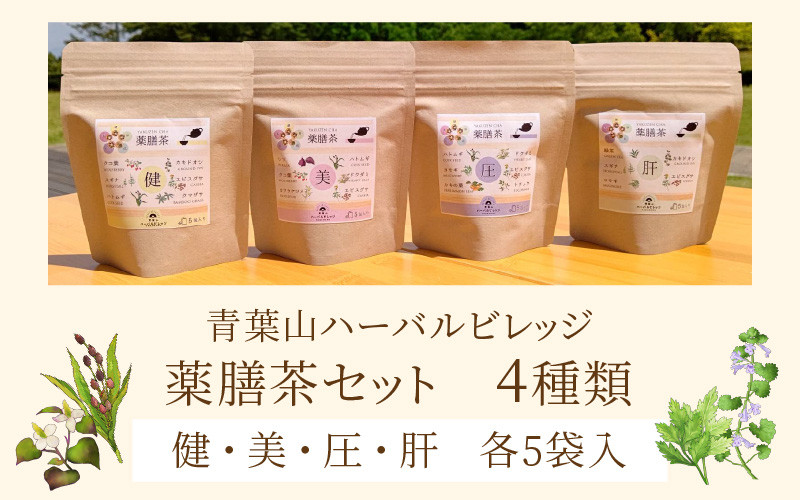 青葉山ハーバルビレッジ人気の薬膳茶シリーズ、健・美・圧・肝の4種類セットです。
