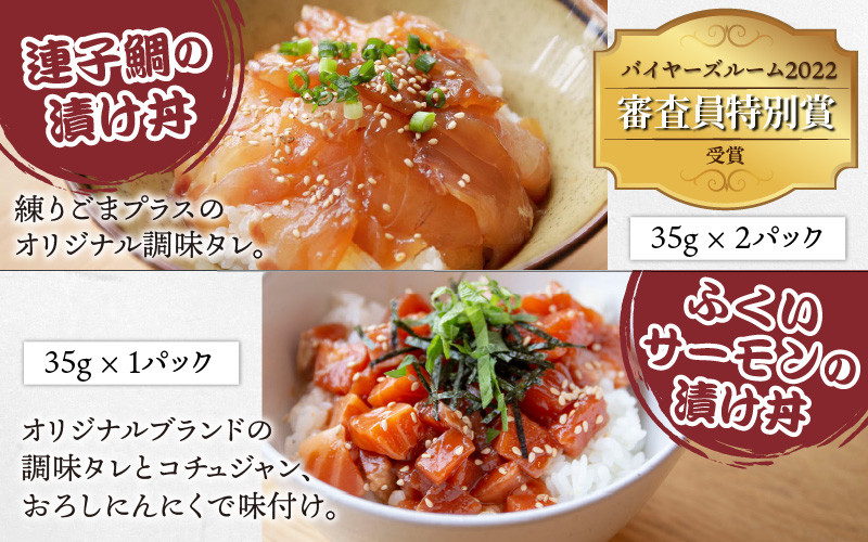 若狭高浜のうみから食堂でも1,2位を争う人気の漬け丼! 干物屋さんの漬け丼 充実セットミニ【急速冷凍】(プロトン凍結)| 漬け丼セット 3種 小分け 海鮮丼 漬け 漬け魚 鯛 タイ 真鯛 真ダイ サーモン 福井サーモン パック 人気 蓮子鯛 冷凍