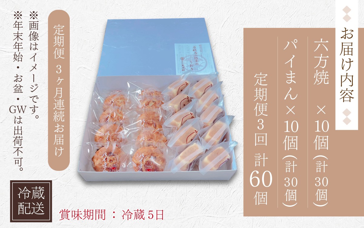 | 容量 | 【3ヶ月定期便】 計60個 六方焼(こし餡)× 10個(計30個) パイまん(つぶ餡)× 10個(計30個) |