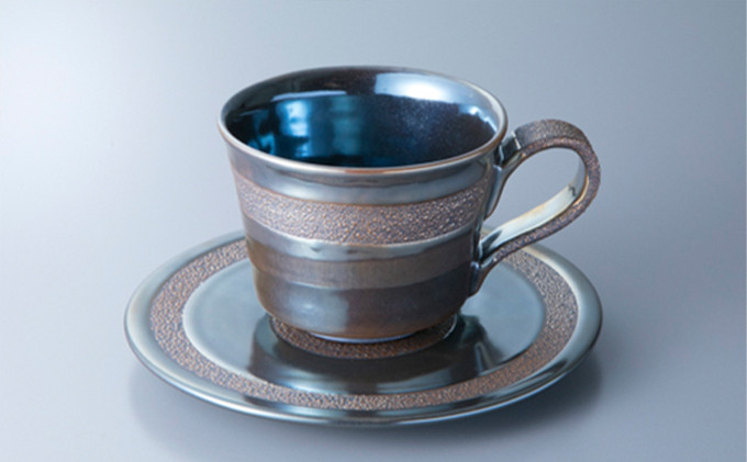 越前土をベースにし、釉薬に鳳足石(若狭産出の天然石)を使用し、独自焼成された金属色の器です。帯状の水滴文様が特徴です。