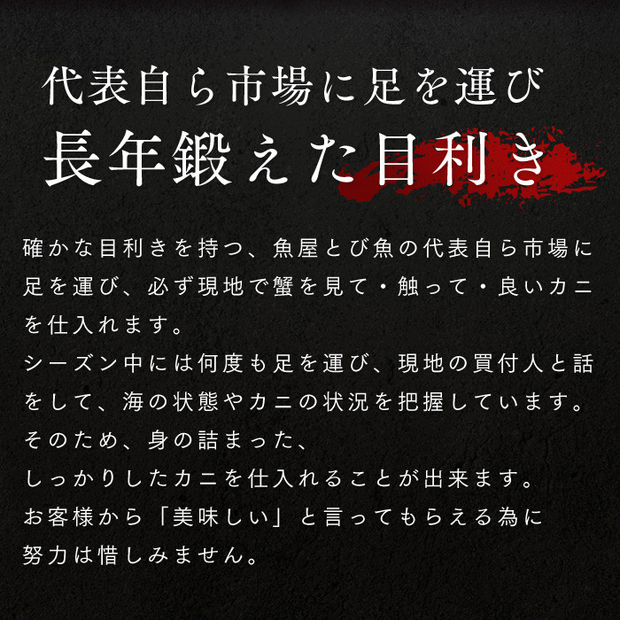 オスに比べて、身は少ないですが、定番の美味しさのカニみそ、プチプチ食感の外子、そして醍醐味の濃厚の内子をお楽しみください。