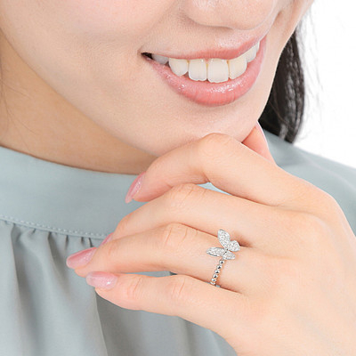 蝶々モチーフの指輪ですが、お付け頂くと指にリボンを巻いたようにも見えとても可憐に見せてくれるお品物でございます。