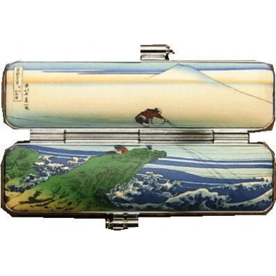 こちらは甲州石班澤(かじかざわ)【六郷IC】ここはハンコ産地の町で有名です。富士川の川幅がグッと狭くなった六郷の月見橋より見た、美しく大きな富士山風景だと思います。六郷商工会真向いにある老舗ハンコメーカー鈴木屋印材店プロデュース。ハンコ産地中部横断自動車道六郷インターを起点に、中部横断自動車道沿線ゆかりの地から望む北斎富士山を中心に、甲州石班澤【六郷IC】・身延川裏不二【身延山IC】・信州諏訪湖【佐久南IC】・東海道江尻田子の浦【富沢IC】・神奈川沖浪裏・凱風快晴の6点のオリジナル応援グッズを用意しました。とてもユニークなのは折り畳み式飾り台をセットすれば、インテリア装飾品としてじっくりと鑑賞して頂けます。もちろん普段使いのポケットサイフとして、アクセサリー、コインはもちろんリップ化粧ケースとしてお使いください。内側には、美しい金襴布地と鮮やかなレットベルベット張りにしてありますので、入れる品物をやさしく守ります。ハンコケース型ポケットサイズなのでどこにでも収納可能で耐久性も非常に高いです。