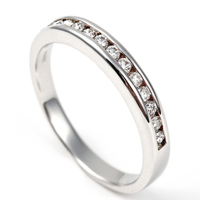 トータル0.2キャラットのダイヤモンドを使って程よいサイズ感にしあげています。ダイヤモンドを通常の爪止めではなくレール留めといい、石の脇のK18の地金を被せるような形で石留めしておりますので、リングの爪でお洋服を傷つけるような心配はなく、ダイヤモンドもリングから飛び出ていないため、まさに日常使いにもってこいのお礼品になっております。