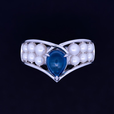 固有の形を持たない「水」。様々に変わりゆく中で滴り、流れ落ちる水の1粒1粒が自然の尊さや美しさ、生命の息吹を感じさせてくれます。丁寧に選別された小さなベビーパールと丸みのある艶やかなカボションカットのサファイアは、光や角度によって変わるほとばしる水の粒をイメージしています。