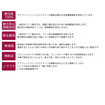 自社農園で育てた葡萄を使用し、栽培期間中化学肥料不使用、こだわりの野生酵母で発酵したこだわりのワインです。