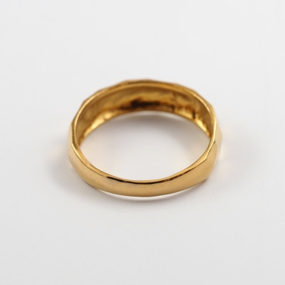 ゴツゴツとした岩肌のような表情が印象的な、幅広デザインの24金リング。
