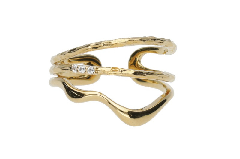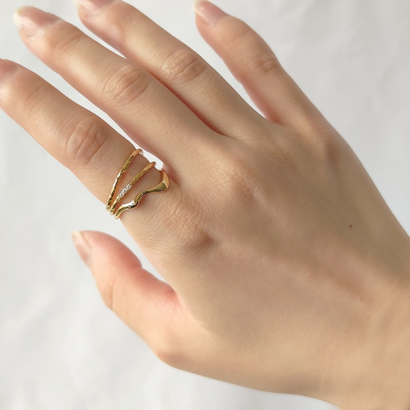 3つのスリムなリングを重ね付けしているように見えるファッショナブルなデザインリングです。