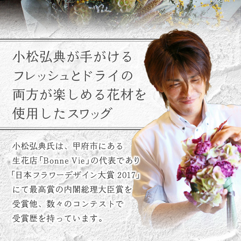 甲府市にある生花店「Bonne Vie」の代表であり「日本フラワーデザイン大賞2017」にて最高賞の内閣総理大臣賞を受賞他、数々のコンテストで受賞歴を持つ小松弘典が手がけるスワッグです。