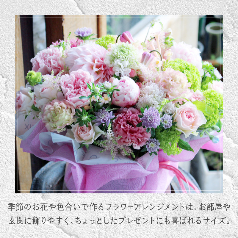 季節のお花や色合いで作るフラワーアレンジメントは、お部屋や玄関に飾りやすく、ちょっとしたプレゼントにも喜ばれるサイズです。