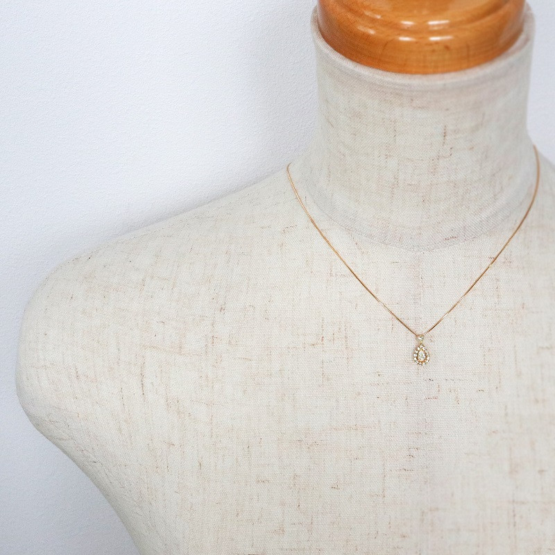 雫のような優しいフォルムと華やかな輝きのぺアシェイプカットダイヤモンドが胸元に大人可愛いを演出します。