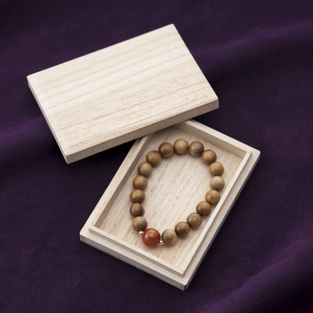 山梨県甲府市は世界有数のジュエリーの街。千年の歴史を誇る国指定の伝統的工芸品「甲州水晶貴石細工」でも知られるように古くから玉石の研磨に高い技術を有し、現在は宝石のカットから、デザイン、宝飾金具の生産に至るまで多くの宝飾業者が集積し、美しく高品質なアクセサリーを全世界に向けてお届けしています。この般若心経ブレスレットは主玉に金色に輝く天然木の黄金楠を、トップに『般若心経』の経文276字を刻み込んだ赤瑪瑙を配した婦人用の和風ブレスレットです。黄金楠はミャンマーなど東南アジアの山岳地帯に産する楠科の灌木で、磨く油分が化学反応を起こし黄金の光沢を放つ希少な木。また『般若心経』を刻んだ赤瑪瑙は仏教の七宝の一つで、富をもたらす宝石。さらに『般若心経』は一切の苦厄を除きます。また天然石を用いたブレスと違い軽く冷たくないので、付け心地も抜群です。あなたを守護し幸運をもたらすお守りブレスとして、ぜひこの機会にお申し込みください。