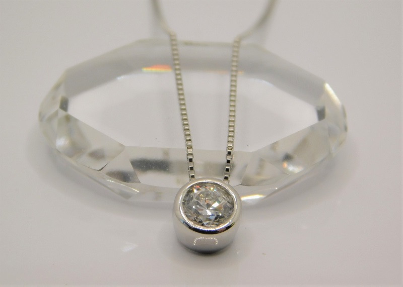 余計な飾りのないベゼルセッティング・ダイヤモンドペンダントはシンプル&スタイリッシュ。ダイヤモンドは高品質【美ダイヤモンド】Dカラー、SIクラス、EX(エクセレントカット)、H&C(ハートアンドキューピッド)を1石(計0.3ctUP)使用しています(GGS鑑定書付)。