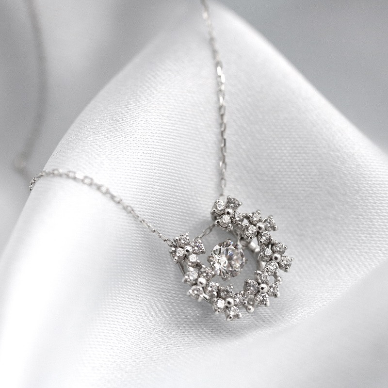 小さな雪の結晶が集まったかのような,華やかで印象深く女性的なデザインが美しいペンダントです。
