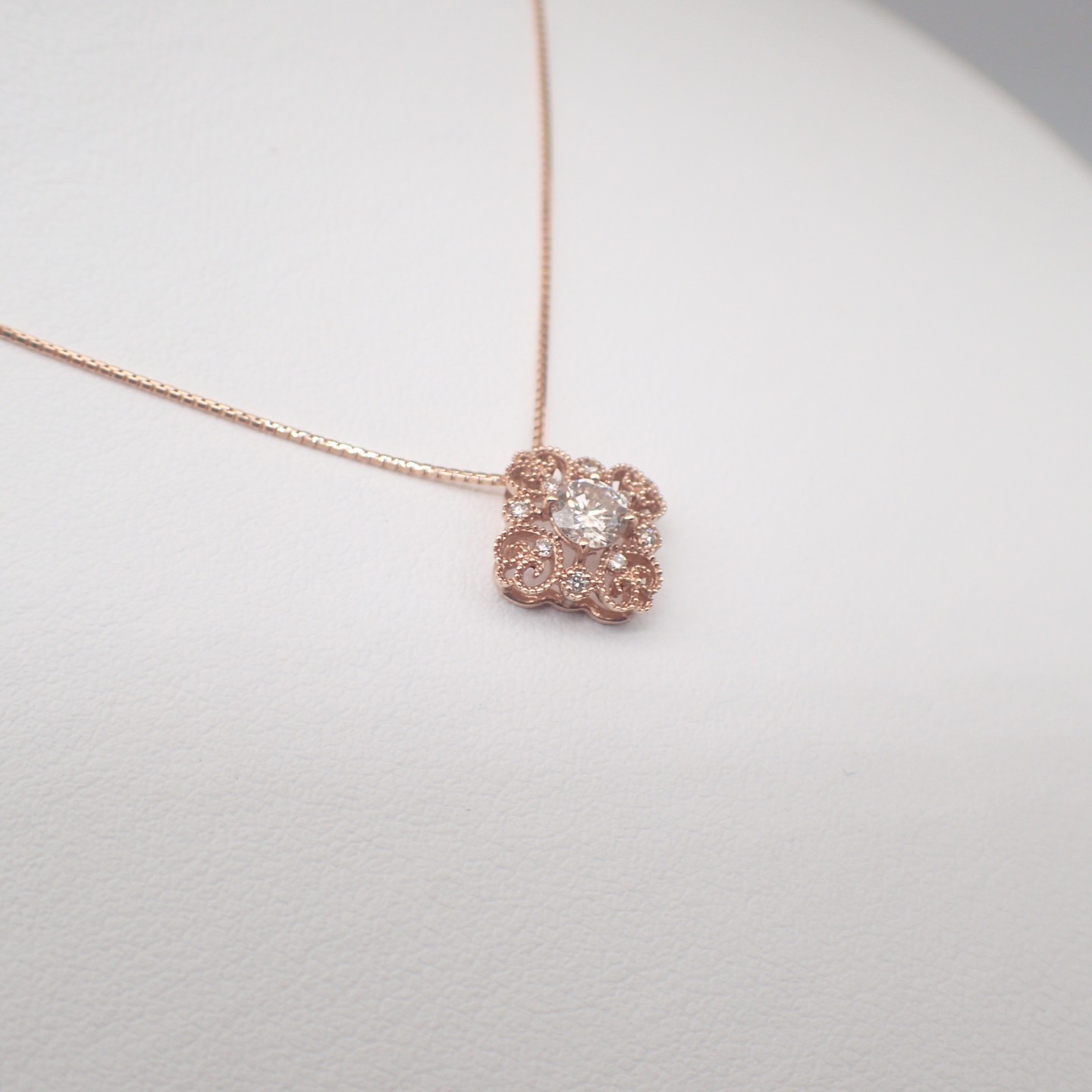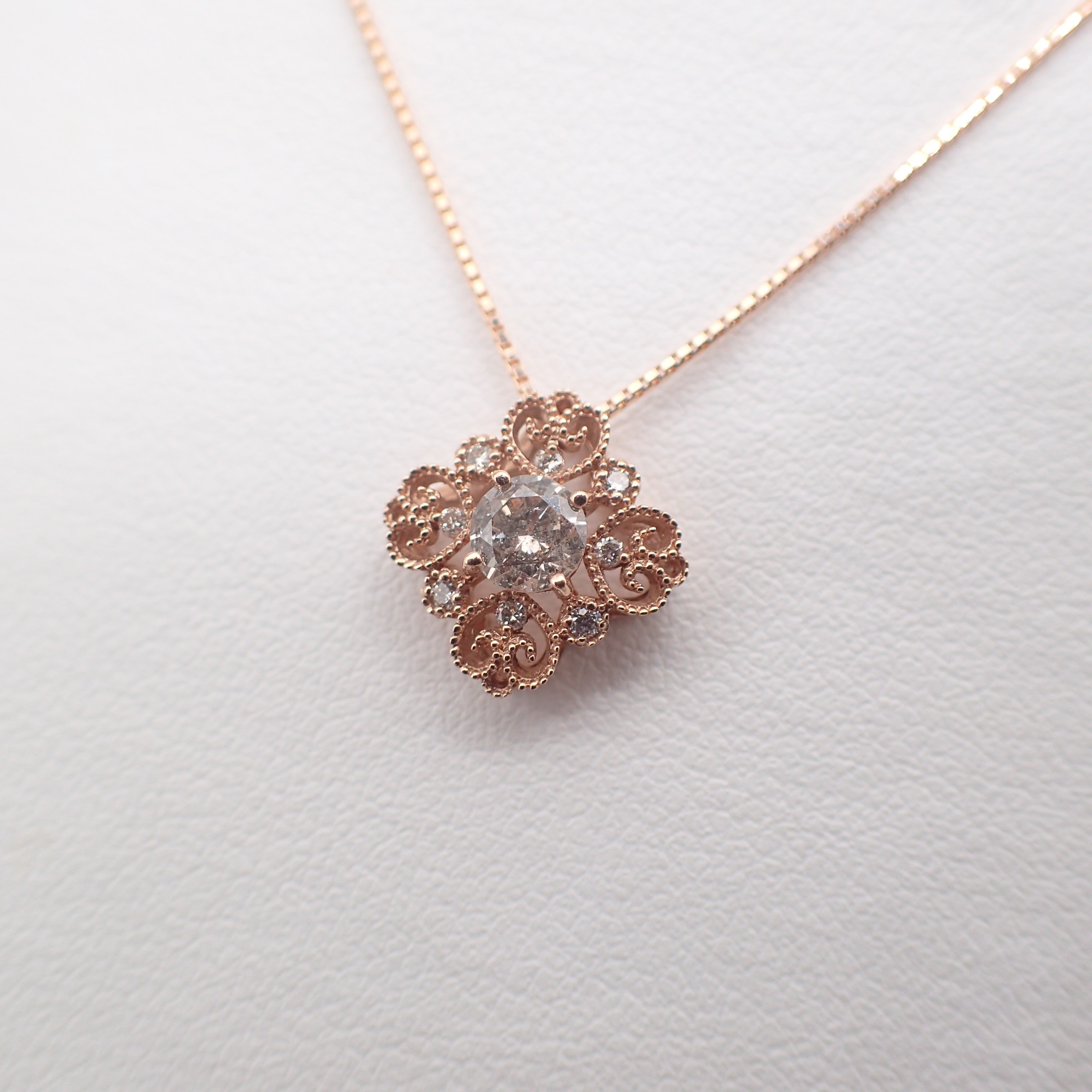 センターはラウンドブリリアントカットの大粒ダイヤモンド。ペンダントデザインはミル打ちした4つのパートにダイヤを配したクラシカルで落ち着いたピンクゴールドペンダントです。ミル打ちはラテン語のミルグレインの技法で千の米粒のようにかわいらしく、永遠で縁起がいいと人気の装飾です。