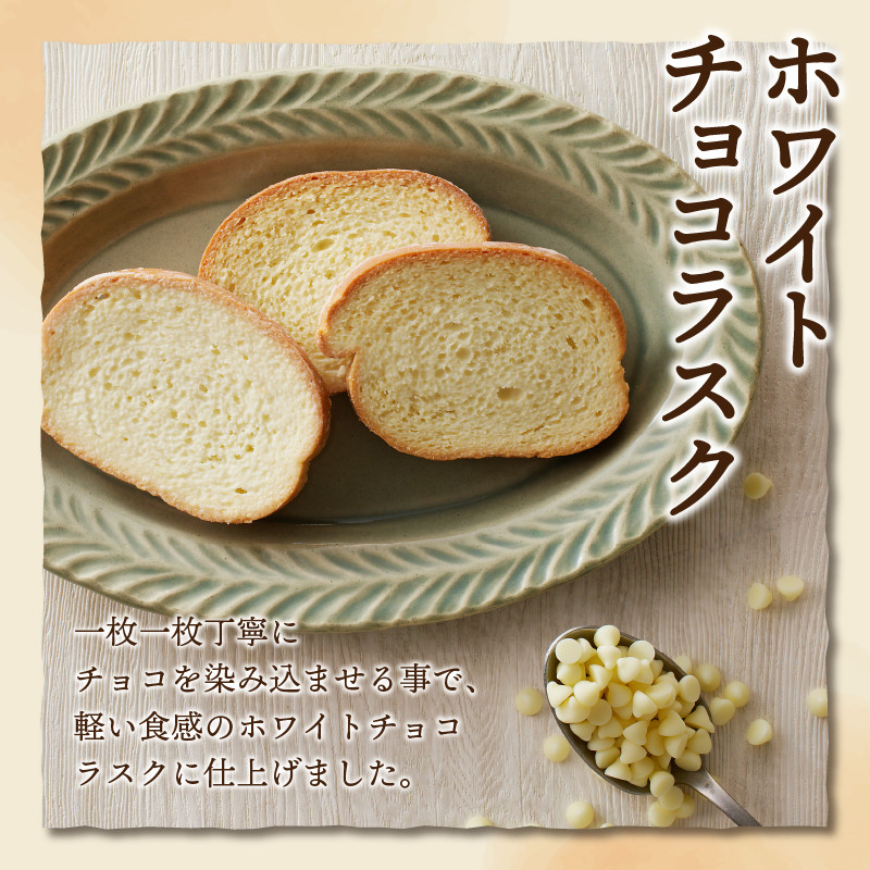 さっくり食感でバターリッチな『リッチシュガーラスク』、アーモンドとキャラメルパウダーのザクザク食感の『キャラメルアーモンドラスク』、チョコを染み込ませた軽い食感でチョコの香りいっぱいの『チョコラスク』、ホワイトチョコを染み込ませた軽い食感の『ホワイトチョコラスク』の定番の4品を詰合せました。4種類それぞれの味をご賞味ください。