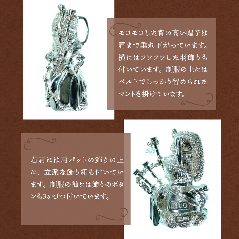 銀細工の彫刻仕様で表情や形、質感が美しい 〈 甲府ジュエリー 〉バグパイプ・テディベアのピンブローチ