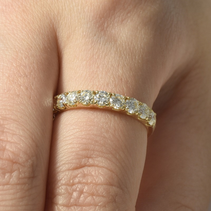 ダイヤモンドを前面にアピールする4本爪のしっかりセッティングダイヤモンドの輝きを存分に楽しめる王道デザイン、1.0カラットのハーフエタニティリングです。希少なハート&キューピッドダイヤモンドを使用し王道デザインに仕立て上げました。不変の輝きを放つダイヤモンドを「ずっと」お楽しみ下さい。激しい輝きのダイヤモンドが際立つデザインなので、これだけでも存在感は抜群です。シンプルデザインなので重ね付けにも最適です。サイズ直しが可能なハーフエタニティですから、将来大切な方へ受け継げるクオリティにこだわりました。ダイアモンドを目立たせながらも地金はたっぷり使い、しっかりと支えています。角ばってシャープなデザインですが、内側は丁寧に磨き上げ、非常になめらかな仕上がりです。ダイヤモンドの角度を揃えることで、どこから見ても綺麗に輝く丁寧なセッティングをしています。ウデ幅・厚さもしっかりと取っており、安心してお使い頂けます。