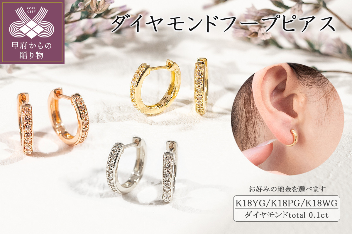 ジュエリーの街甲府の職人が作るフープタイプのダイヤモンドピアスです。 〈 甲府ジュエリー 〉K18ダイヤモンドフープピアス(0.1ct) 【選べる地金3種】