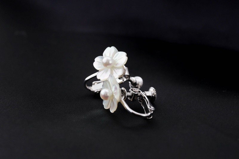 耳元に纏う日本の美 桜シェルイヤリング < 甲府ジュエリー >白蝶貝×ベビーパール 桜シェルイヤリング/No.74