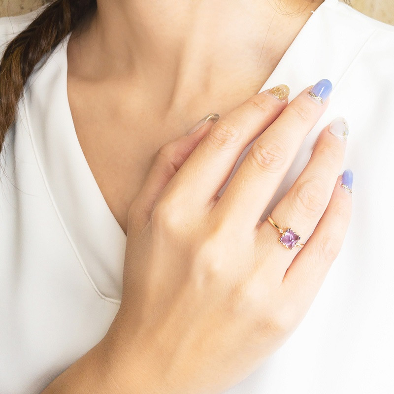 アメジストはニュアンス感がある爪でセッティングされクラシカルな雰囲気が魅力的です。サイドに輝くダイヤモンドも華やぎがあります。