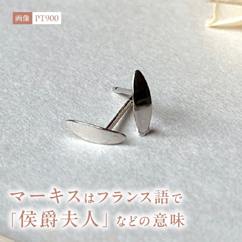 今回ご提案させて頂きます商品はマーキスピアスです。マーキスとは、フランス語で「侯爵夫人」などの意味を持ちます。大きさは縦が約6.5mm、横が約2.5mm。シンプルで可愛らしいデザインです。普段使いにもさりげなくワンポイントとしてもおすすめです。ファーストジュエリ-やギフトにも最適です。素材もPt900/K18を使用しております。キャッチも地金入りのシリコンキャッチを使用しております。