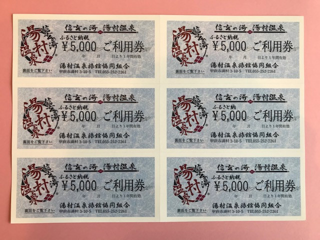 【関連ワード】チケット 利用券 湯村温泉 信玄の湯 A5セット 6枚 3万円分 常磐ホテル 甲府記念日ホテル 柳屋 旅館明治 楽水園 杖温泉 弘法湯 ホテル吉野 美和田旅館 嶋屋旅館