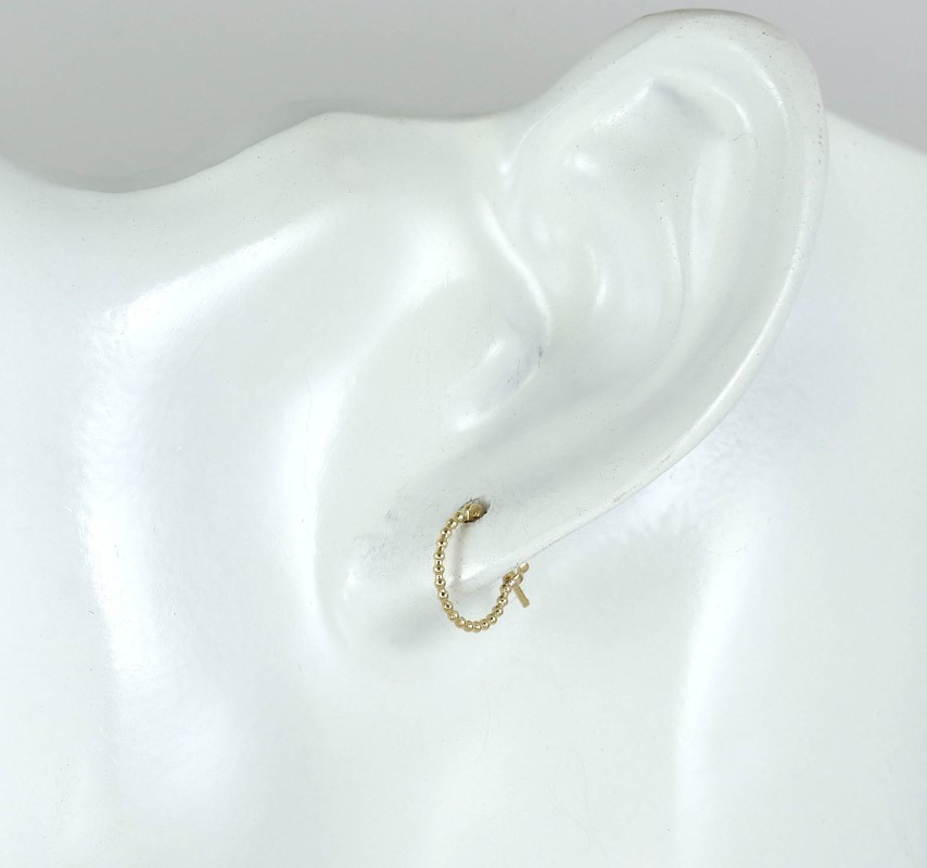 K18ゴールドの小さな丸玉が連なったフープピアスです。小さなつぶつぶが可愛らしく華奢なデサインで、シンプルながら一味違った雰囲気になっています。幅1ミリ・外径1センチと小ぶりなので、普段使いに、さりげないワンポイントとしてもおすすめです。留め具はワンタッチで装着する遮断式で、キャッチをなくす心配がありません。