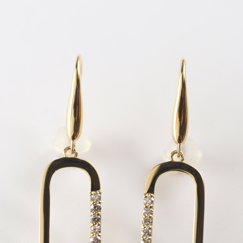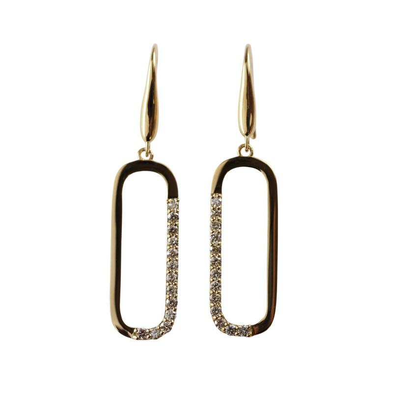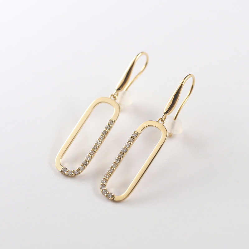 楕円の存在感あるピアスです。シンプルでモダンなデザインに、天然ダイヤモンドがキラキラと光ります。さり気なく揺れるモチーフが顔まわりを美しく演出してくれます。