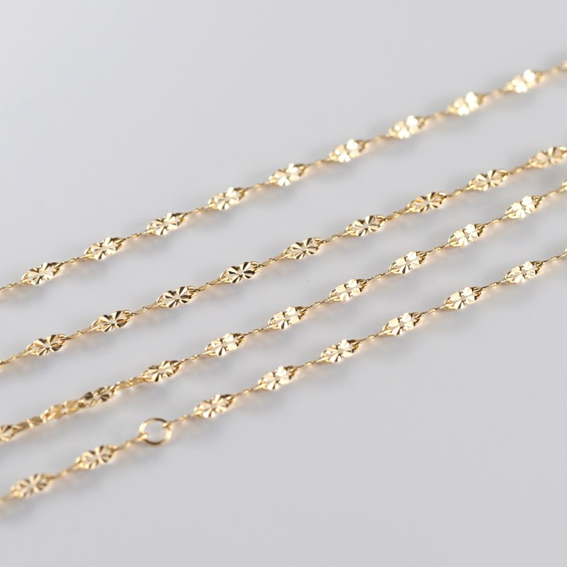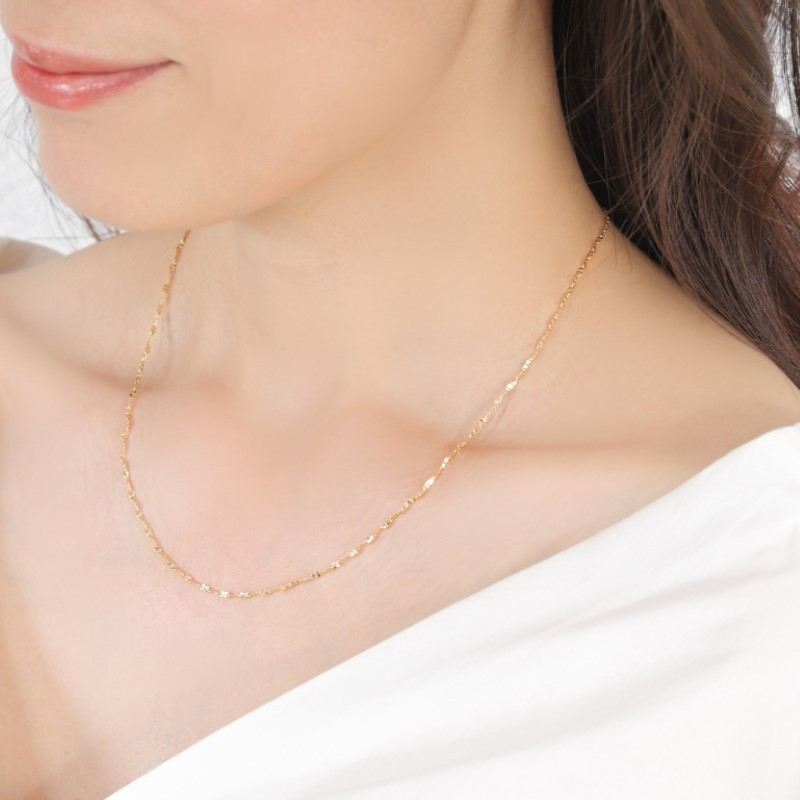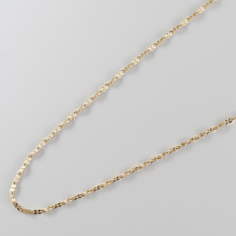 地金の輝きが美しいフラワーが、上品ながらもさり気なく可愛らしい雰囲気。フェミニンなデザインチェーンとなっています。
