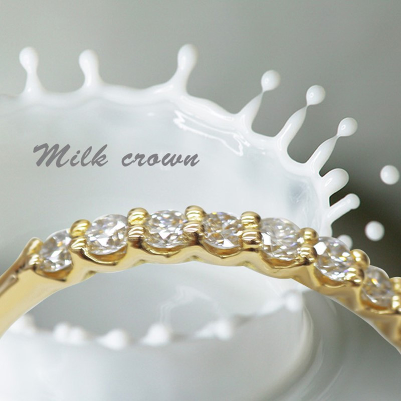 石枠が、ミルククラウンのデザインになっており、繊細な細工が光を取り込みダイヤモンドを輝かせます。