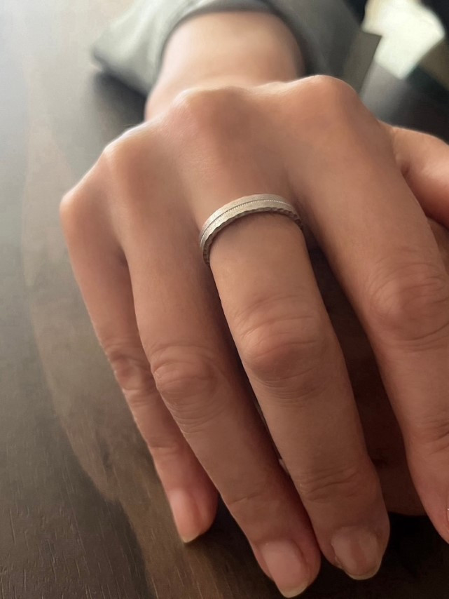 平らな部分には、ラメのように細かくキラキラする仕上げをしました。単なるつや消しではなく、上品な仕上がりになることで、指輪の存在感がアップ。そしてそのセンターにまっすぐに刻まれたラインは、極小のミルグレイン。一粒一粒、同じ大きさ、同じ形に手作業にて打ち込みます。