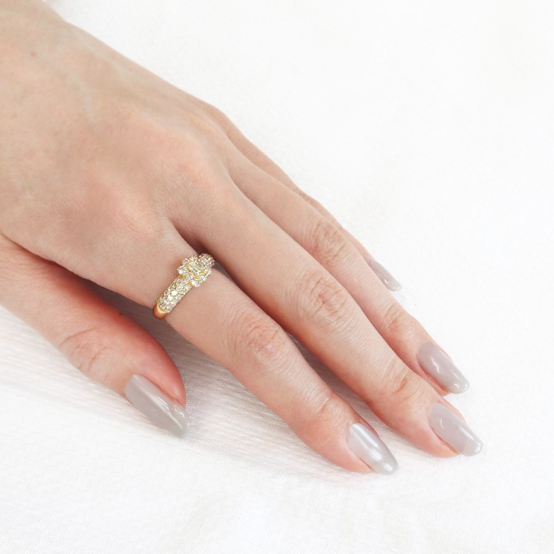 繊細な輝きのパヴェに凛と煌めくバゲットカットダイヤモンドが対照的で、存在感の大きな女性らしい豪華なリングです。